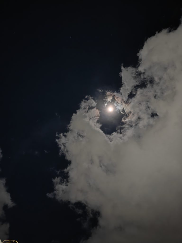 云絮揉碎了夜的深蓝,月亮从绒絮的缝隙里漏出光来——是今晚天空藏的小甜饼。